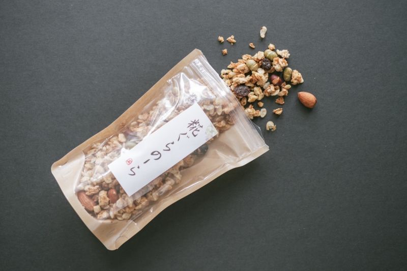 - 有機オーツ麦・有機玄米フレーク・甘糀・アーモンド・炒り大豆・レーズン・米粉・太白胡麻油・きび砂糖・藻塩